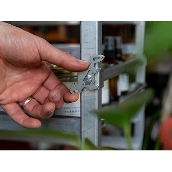 El Dino es una multiherramienta pequeña pero práctica para acoplar al llavero y contiene un destornillador de cabeza plana, un destornillador Phillips, un abrebotellas, un abrecartas y una llave inglesa número 5, 5.5, 7 y 10. Una herramienta práctica para llevar contigo cada día.